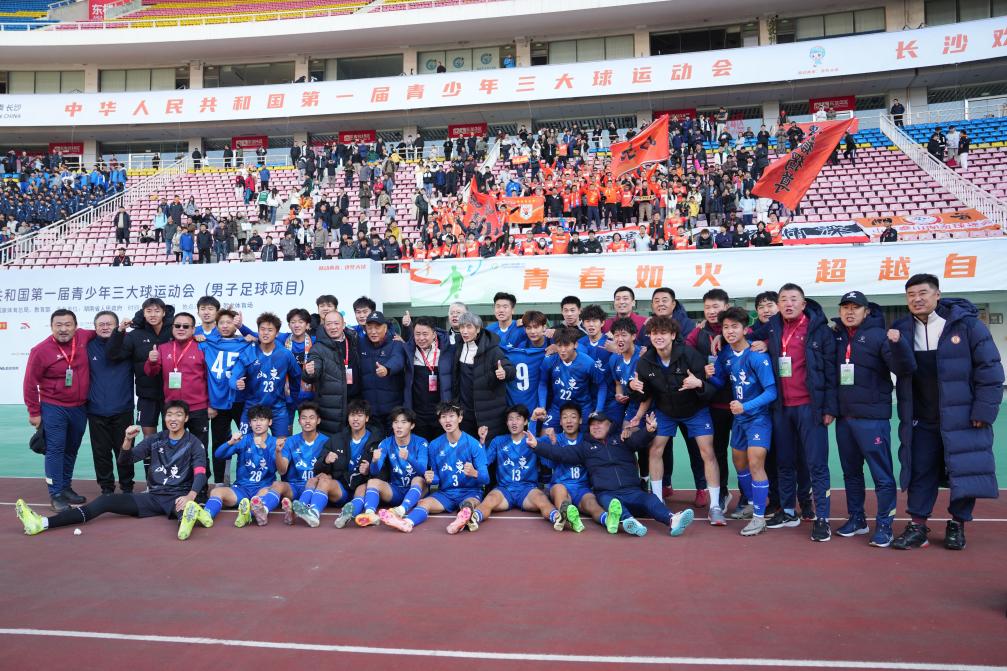 11月27日,山东队成员在比赛后与看台上的球迷合影。当日,在中华人民共和国第一届青少年三大球运动会足球项目男子决赛中,山东队1比0战胜上海队,夺得冠军。新华社记者 薛宇舸 摄