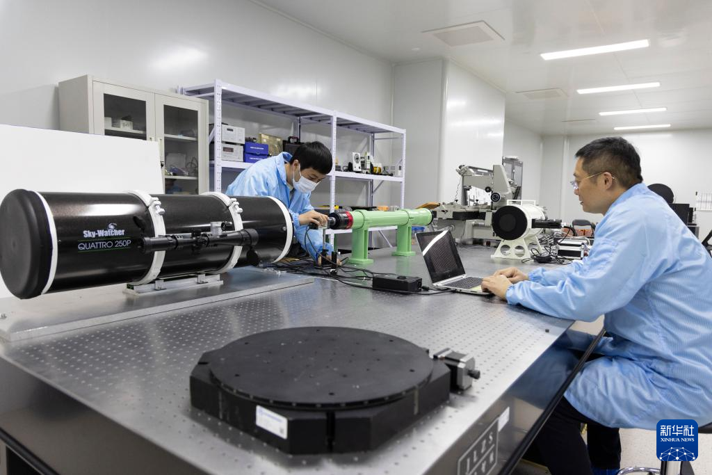 11月27日,在中国科学院空天信息创新研究院实验室,张泽研究员(右)和团队成员在调试实验设备。新华社记者 金立旺 摄pagebreak