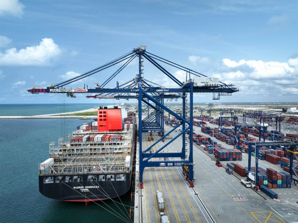 3月11日,一艘货轮在尼日利亚拉各斯莱基深水港装卸集装箱(无人机照片)。新华社发(莱基港公司供图)