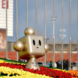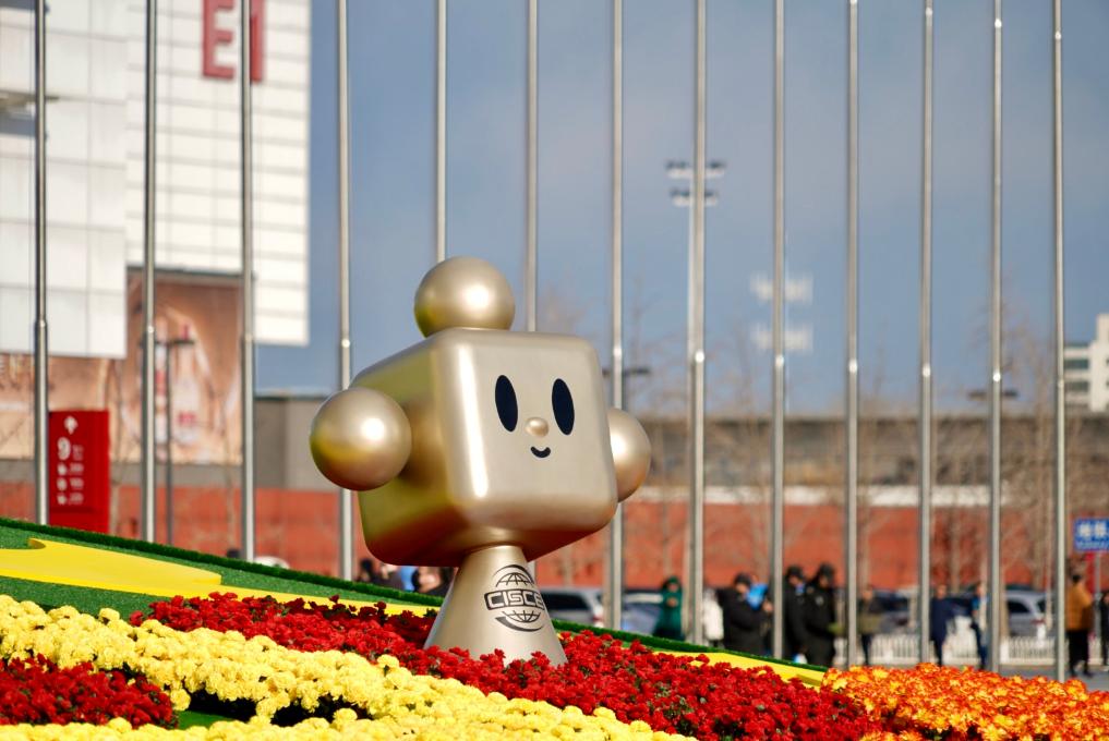 这是11月26日在中国国际展览中心顺义馆拍摄的链博会吉祥物“链氪”形象。新华社记者肖恩楠 摄