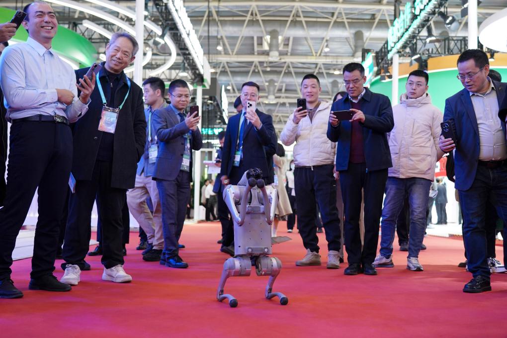 11月26日,人们在第二届中国国际供应链促进博览会上观看机器狗表演。新华社记者 张晨霖 摄