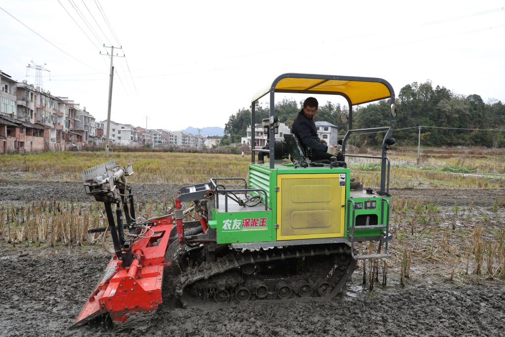11月26日,在湖南省娄底市双峰县荷叶镇,一名农机手在驾驶旋耕机旋耕土地。新华社记者王婧嫱 摄