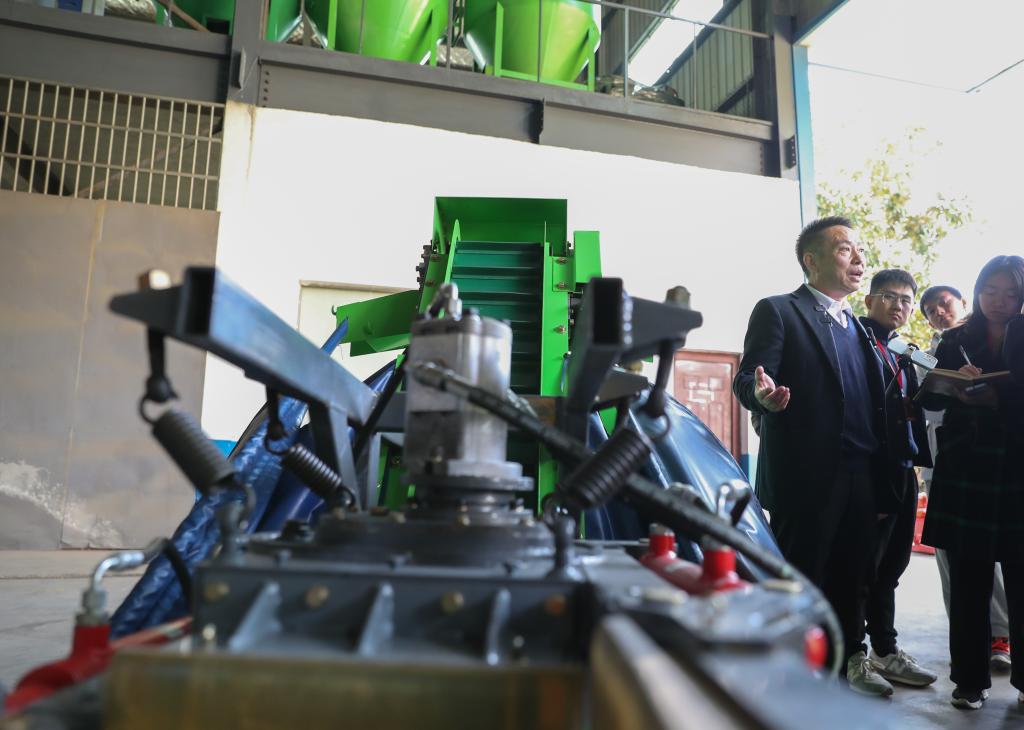 11月27日,在湖南省娄底市双峰县,湖南省农友机械集团有限公司负责人刘若桥(左一)向来访者介绍一款油茶果采收机。新华社记者王婧嫱 摄