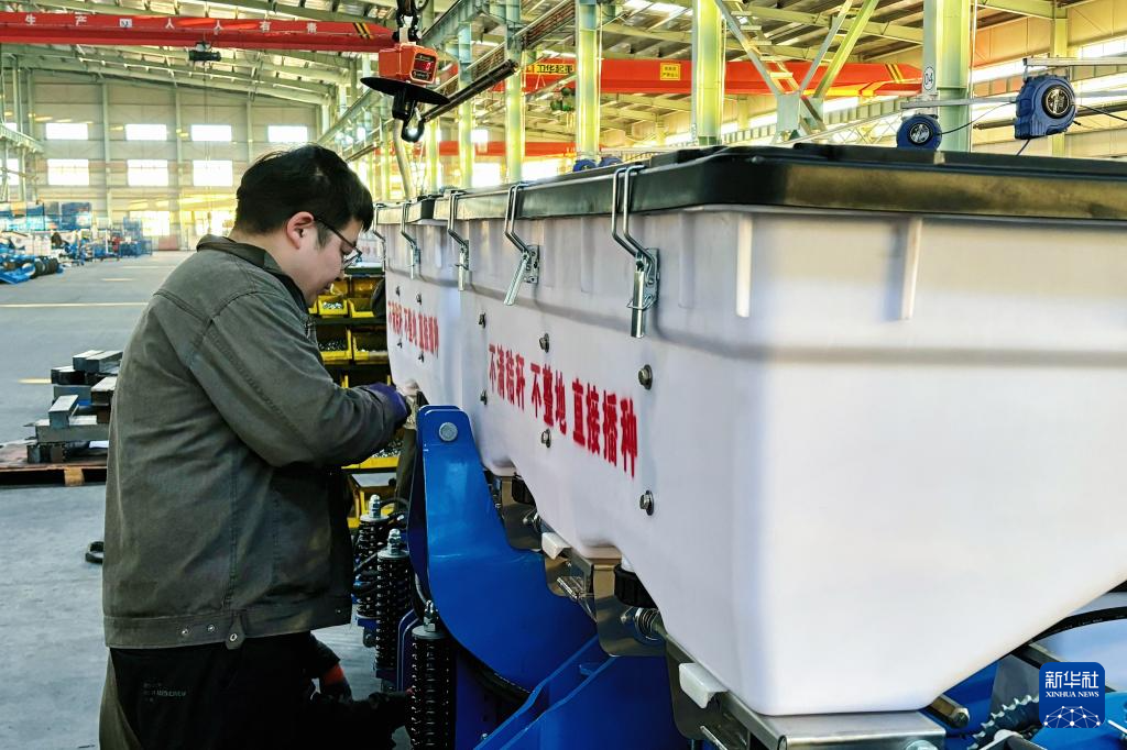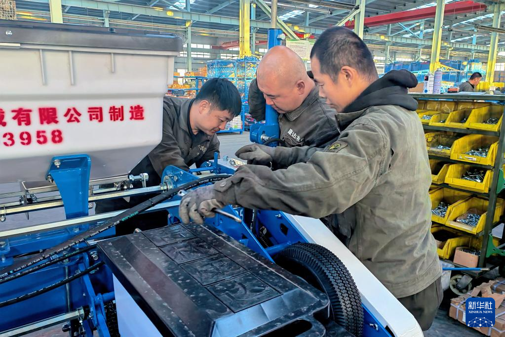 11月18日,在吉林省四平市,吉林省康达农业机械有限公司工作人员在生产车间内安装调试农机设备。新华社记者 薛钦峰 摄
