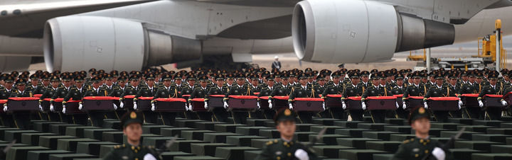 2014年3月28日,搭载437具中国人民志愿军烈士遗骸的专机降落在沈阳桃仙国际机场,礼兵护送志愿军烈士遗骸棺椁至棺椁摆放区。新华社记者 李钢 摄