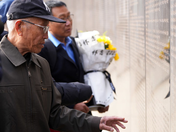 志愿军烈士史万忠的儿子史荣升(前)在沈阳抗美援朝烈士陵园的烈士英名墙上寻找父亲的名字(2024年4月3日摄)。新华社记者 李钢 摄