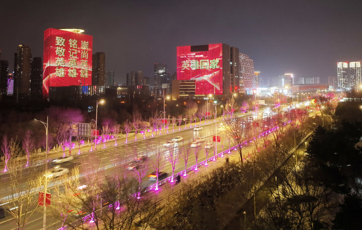 最近几天,整个城市的楼宇亮化、公交地铁站牌甚至出租车上,到处都闪烁着红底金字的标语:“山川同念,英雄回家”“热血洒疆场,忠魂归故乡”“只要我们永远记着,英雄就永远活着”……人们以最高礼遇,表达对英雄的敬意与爱戴。