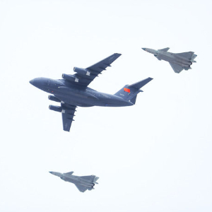 2024年11月28日,接运第十一批在韩中国人民志愿军烈士遗骸回国的空军运-20专机在空军两架歼-20战机的伴飞护航下,抵达沈阳桃仙国际机场上空。新华社记者 杨青 摄