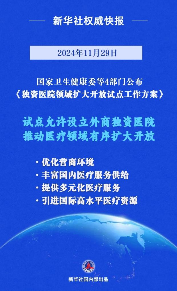国家卫生健康委、商务部、国家中医药局、国家疾控局4部门印发的《独资医院领域扩大开放试点工作方案》2024年11月29日公布。