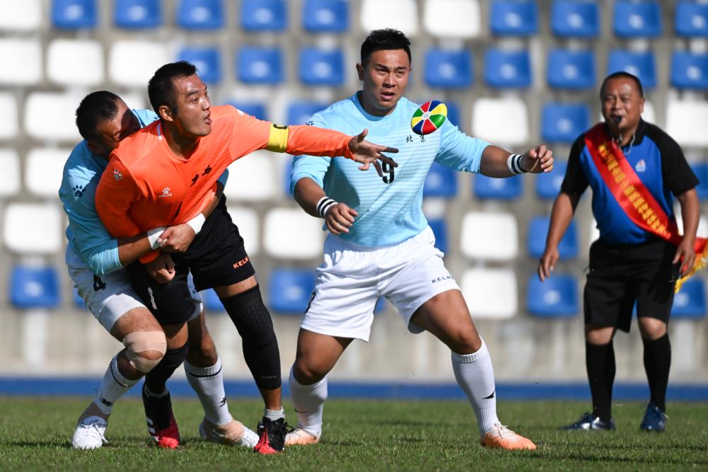 11月24日,在三亚市体育中心举行的第十二届全国少数民族传统体育运动会室外表演项目中,新疆队球员阿卜杜拉艾孜则·阿卜杜海娃尔(前右)在麦热球表演中。新华社记者 陈朔 摄