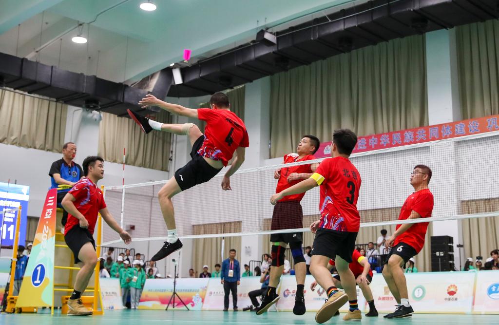 11月29日,北京队球员魏来(左二)在比赛中进攻。当日,在海南省三亚市举行的第十二届全国少数民族传统体育运动会毽球项目男子三人赛决赛中,北京队2:1战胜广东队,获得一等奖。广东队获得二等奖。新华社记者 李旭伦 摄