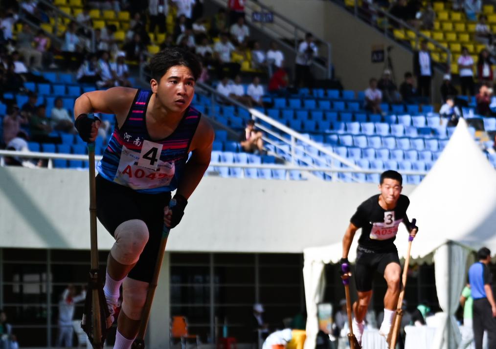 11月29日,河南队选手韦巍(左)在比赛中。最终,河南队获得三等奖。当日,第十二届全国少数民族传统体育运动会高脚竞速男子2x200米接力决赛在海南省三亚市举行。新华社记者 张博文 摄