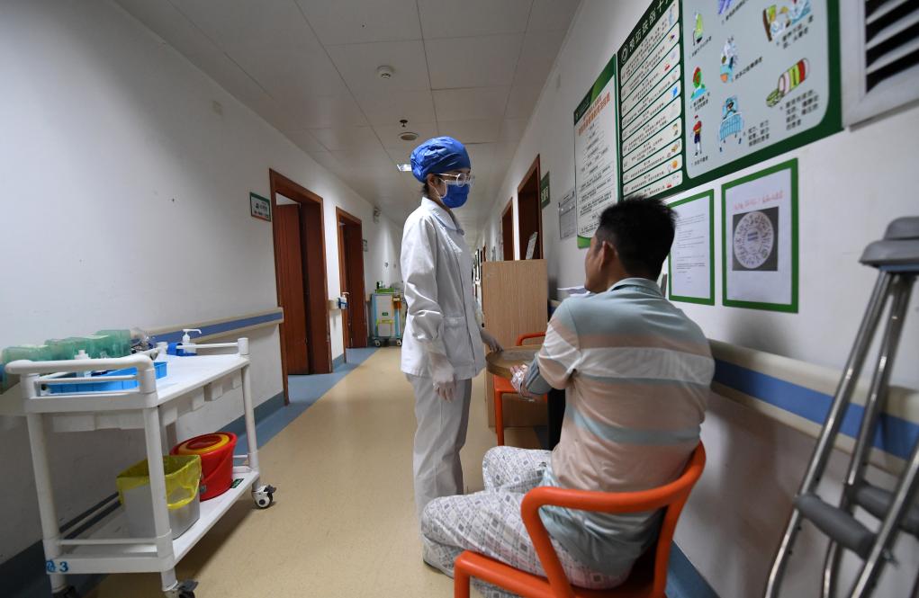 在南宁市第四人民医院,黄小贤在病房区走廊和病人谈心(2023年5月10日摄)。