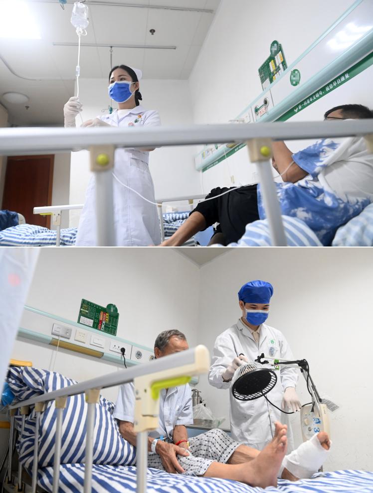 这是一张拼版照片。在南宁市第四人民医院,吴雅静(上图)在给病人打点滴,杨江华(下图)在护理病人(2024年5月11日摄)。