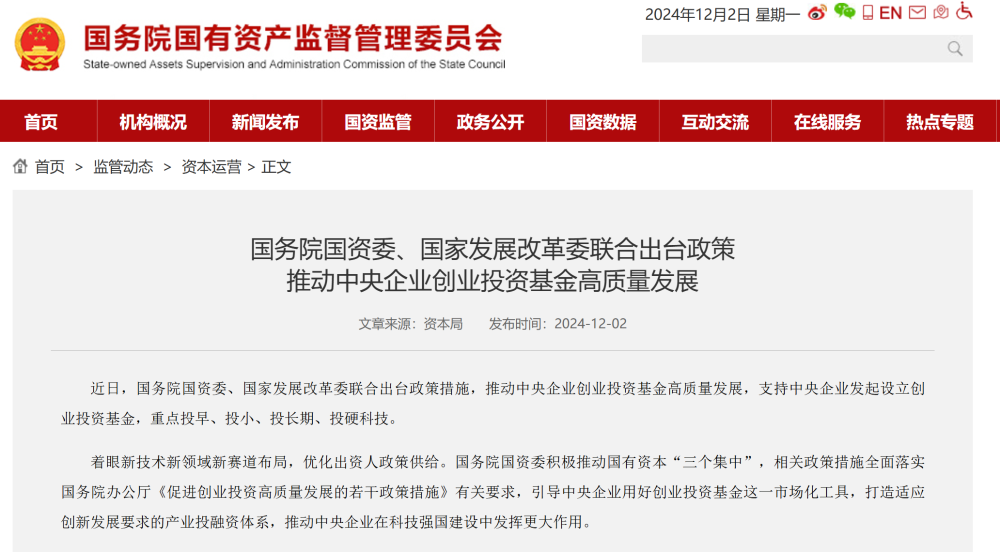 国务院国资委12月2日发布的信息显示,近日,国务院国资委、国家发展改革委联合出台政策措施,推动中央企业创业投资基金高质量发展,支持中央企业发起设立创业投资基金,重点投早、投小、投长期、投硬科技。