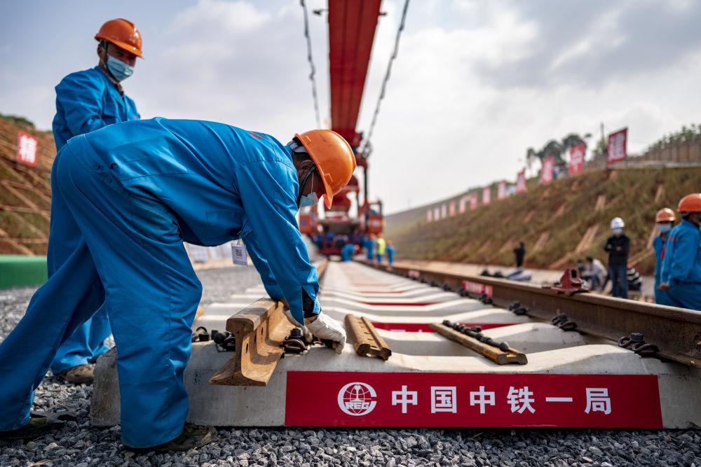 2020年4月7日,中老铁路国内玉溪至磨憨段铺轨全面启动。这是工人在云南玉溪境内的施工现场铺设轨道。