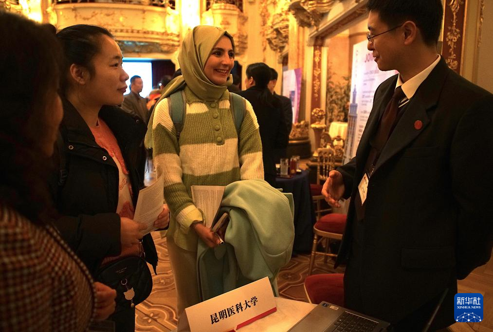 12月2日,在捷克布拉格举办的“留学中国”教育展上,工作人员向参观者介绍情况。新华社发(达娜·科什奈洛娃摄)