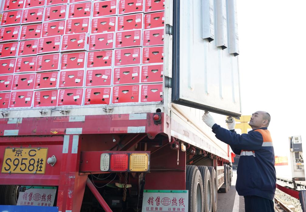 在昆明城郊的中铁联集昆明中心站内,大卡车穿梭不停,集装箱集结、吊装、分拨等作业有条不紊地进行。