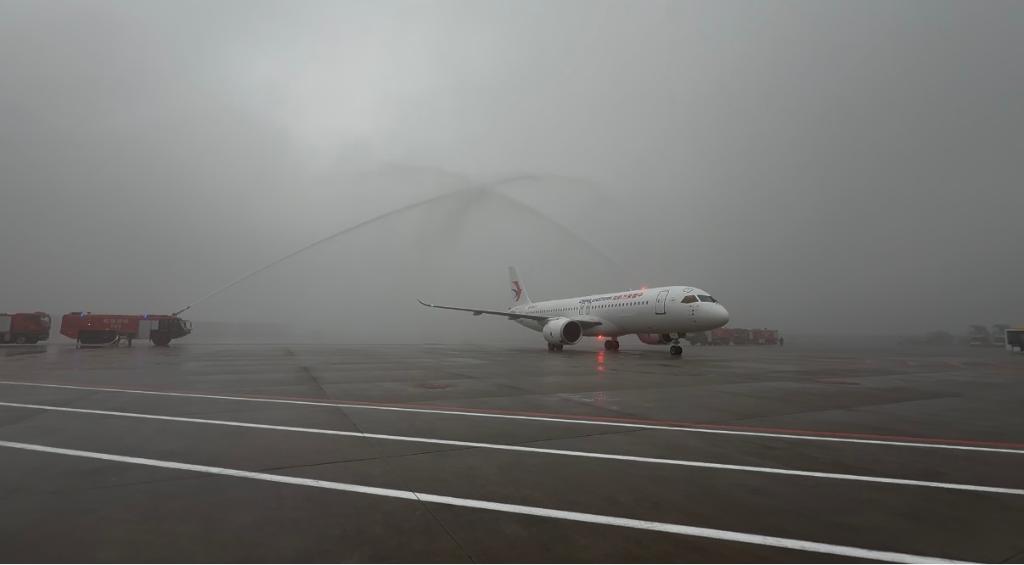 国产大飞机C919在重庆江北国际机场通过水门。新华社记者 赵佳乐 摄