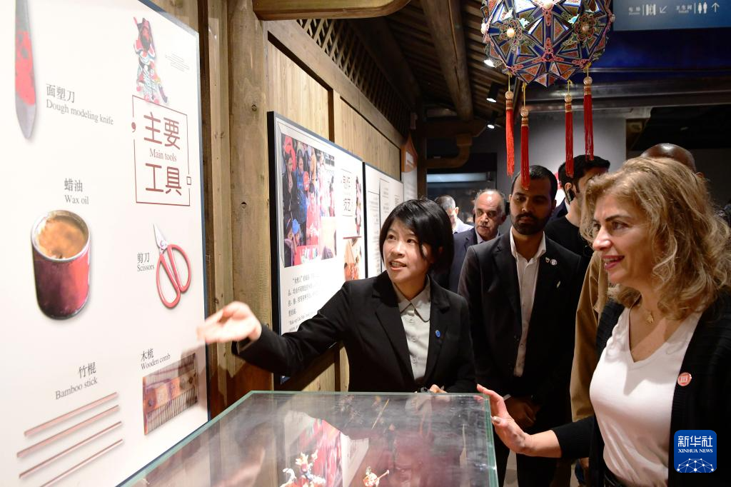 阿拉伯国家驻华使节团在泉州非物质文化遗产馆观看泉州非遗“妆糕人”制作技艺的介绍(12月1日摄)。 新华社记者 魏培全 摄