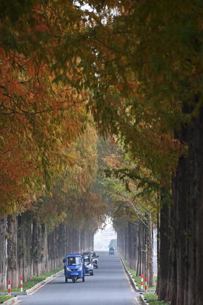 初冬时节,浙江省桐庐县梅蓉村,村口一条长500米的水杉大道迎来最美的时节——水杉树色彩斑斓,村民往来其间,构成一幅美丽的风景画。