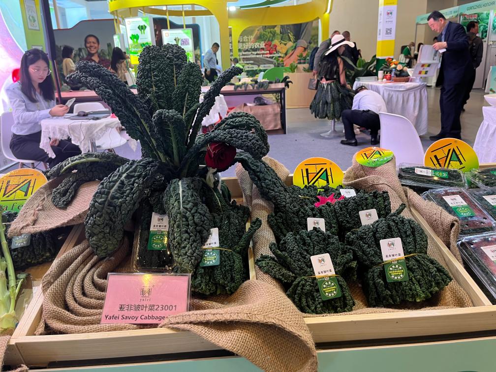 叶片呈墨绿色、褶皱密布的皱叶菜,连日来吸引了各国外商驻足品尝。这个新品种蔬菜维生素C含量很高,富含叶酸、胡萝卜素等营养物质,还能“一菜多吃”,不仅嫩叶能食用,老叶可用于榨汁或制作蔬菜粉。