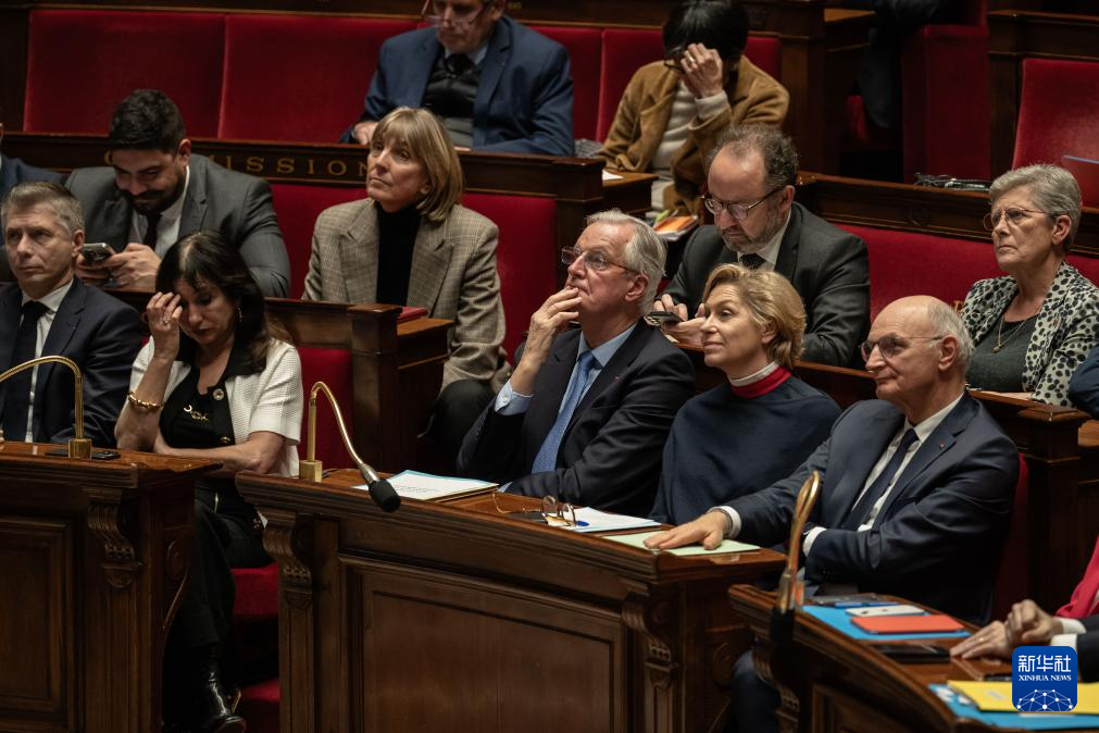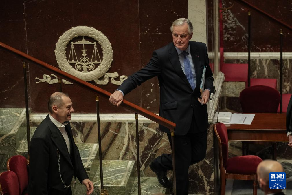 12月4日,在法国巴黎,法国总理巴尼耶出席国民议会就对政府不信任动议投票表决前辩论。新华社发(奥雷利安·莫里萨尔摄)