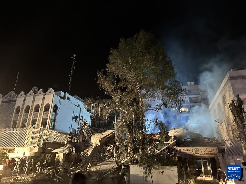 这是2024年4月1日在叙利亚大马士革拍摄的遭导弹袭击的伊朗驻叙利亚使馆(手机照片)。新华社记者 冀泽 摄