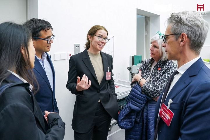 在上博东馆开放式文物修复实验室,美国大都会艺术博物馆首席运营官、首席财务官詹姆森·凯莱赫(左三)与美国国立亚洲艺术博物馆馆长蔡斯·鲁宾逊(右一)等嘉宾交流。上海博物馆供图