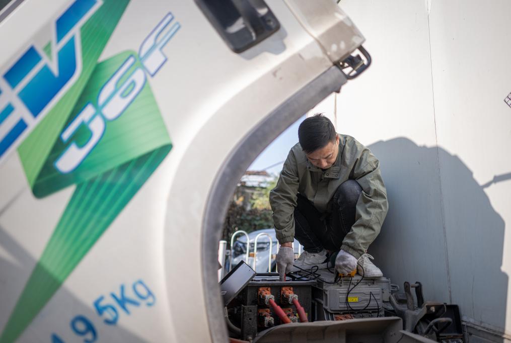 12月5日,李培伟在新能源汽车修理店忙碌。