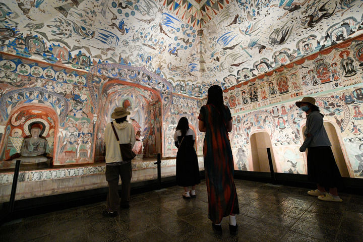 2024年6月7日,在敦煌石窟文物保护研究陈列中心,游客参观莫高窟复制洞窟第276窟壁画。新华社记者 郎兵兵 摄