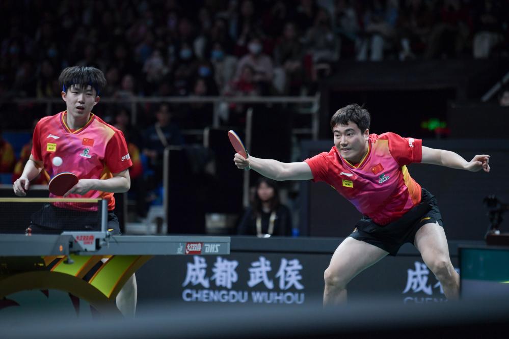 12月5日,中国队组合王楚钦/梁靖崑(右)在男双比赛中。新华社记者 王曦 摄