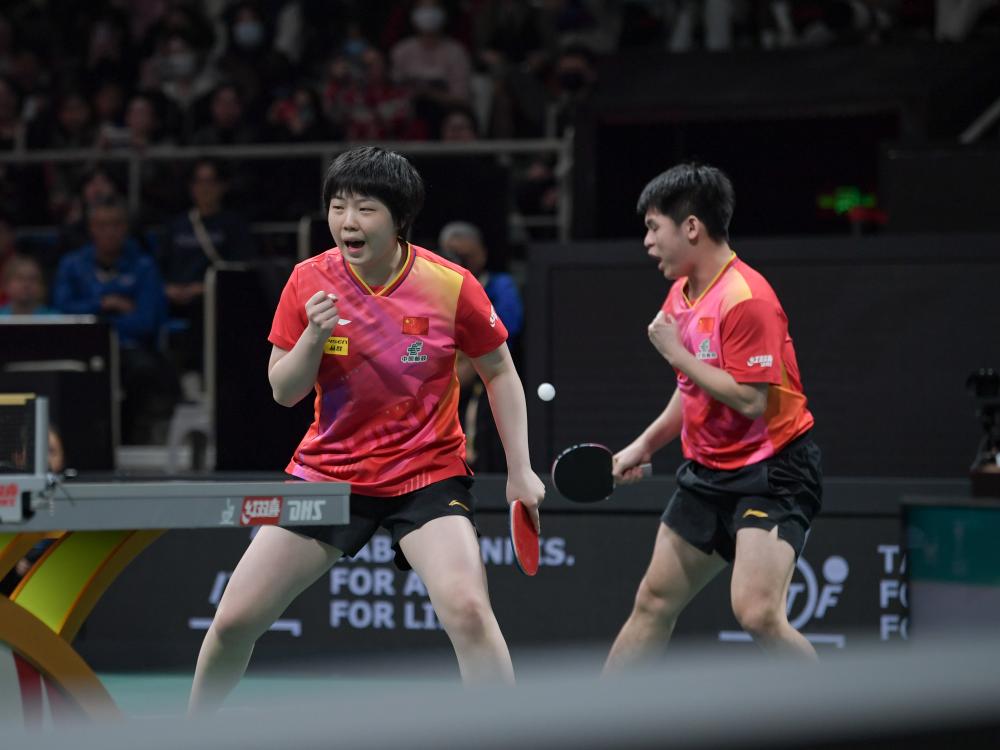 12月5日,中国队组合王楚钦(左)/孙颖莎在混双比赛中。新华社记者 江宏景 摄