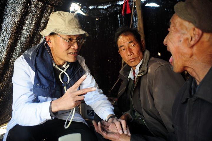 2012年10月30日,王万青(左)在牧民帐篷内为牧民诊断病情(资料图片)。新华社记者 张锰 摄