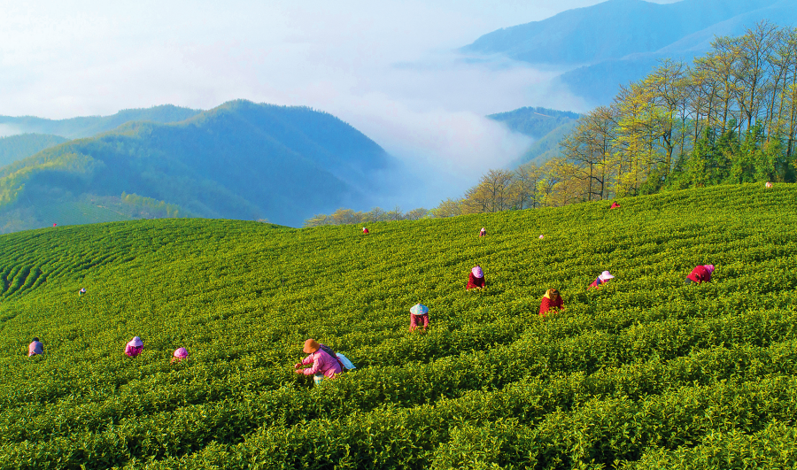 茶工在浙江省湖州市安吉县杭垓镇的生态茶园里采摘明前茶(2023年4月2日摄)。夏鹏飞摄/本刊