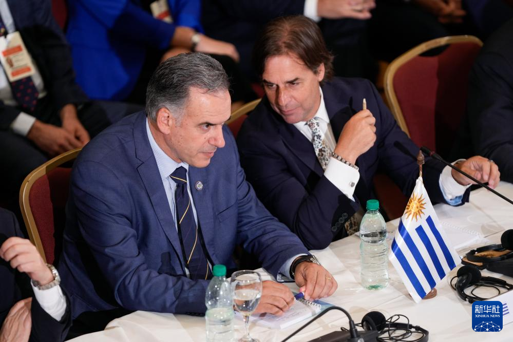 12月6日,乌拉圭现任总统拉卡列(右)和当选总统奥尔西在蒙得维的亚出席南共市首脑会议。新华社发(尼古拉斯·塞拉亚摄)