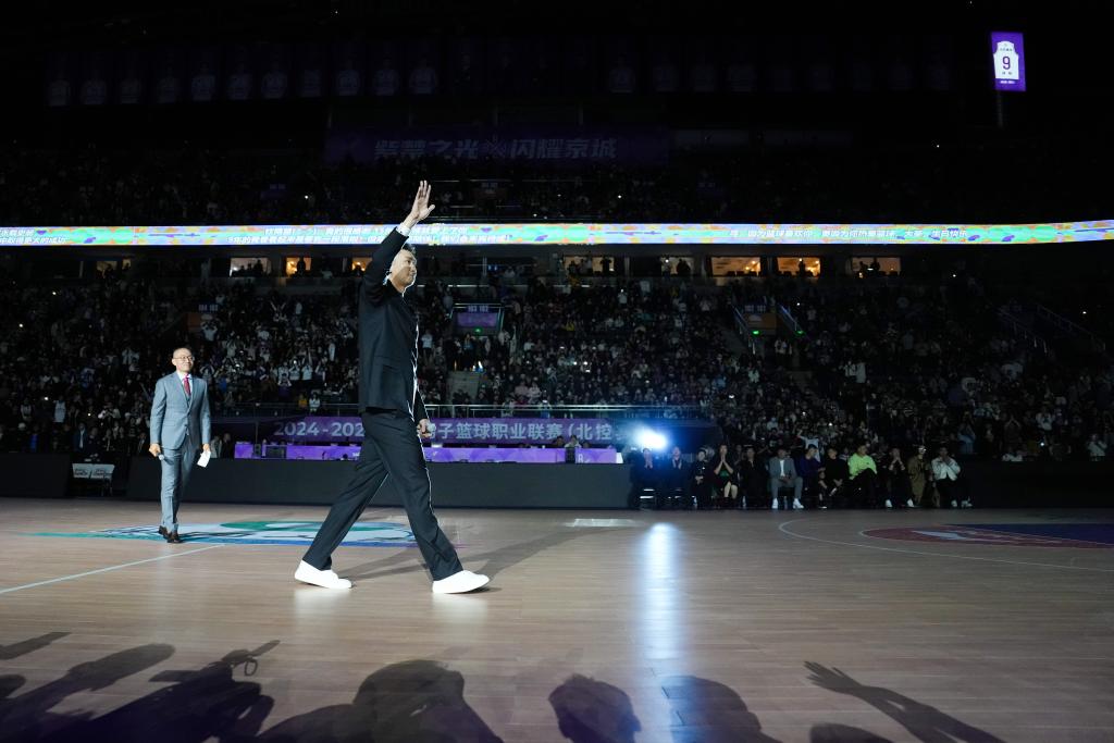 12月6日,在球衣退役仪式上,孙悦(前)向全场球迷挥手道别。新华社记者 鞠焕宗 摄