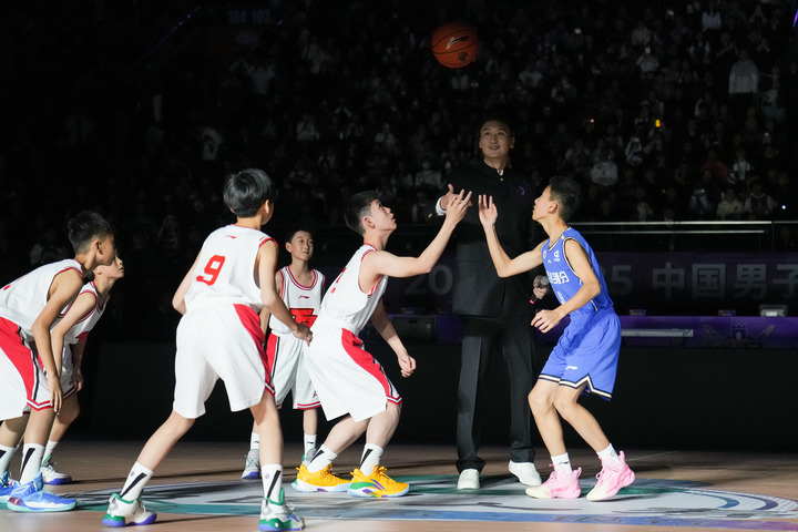 12月6日,在球衣退役仪式上,孙悦(右二)为小球员开球。新华社记者 鞠焕宗 摄