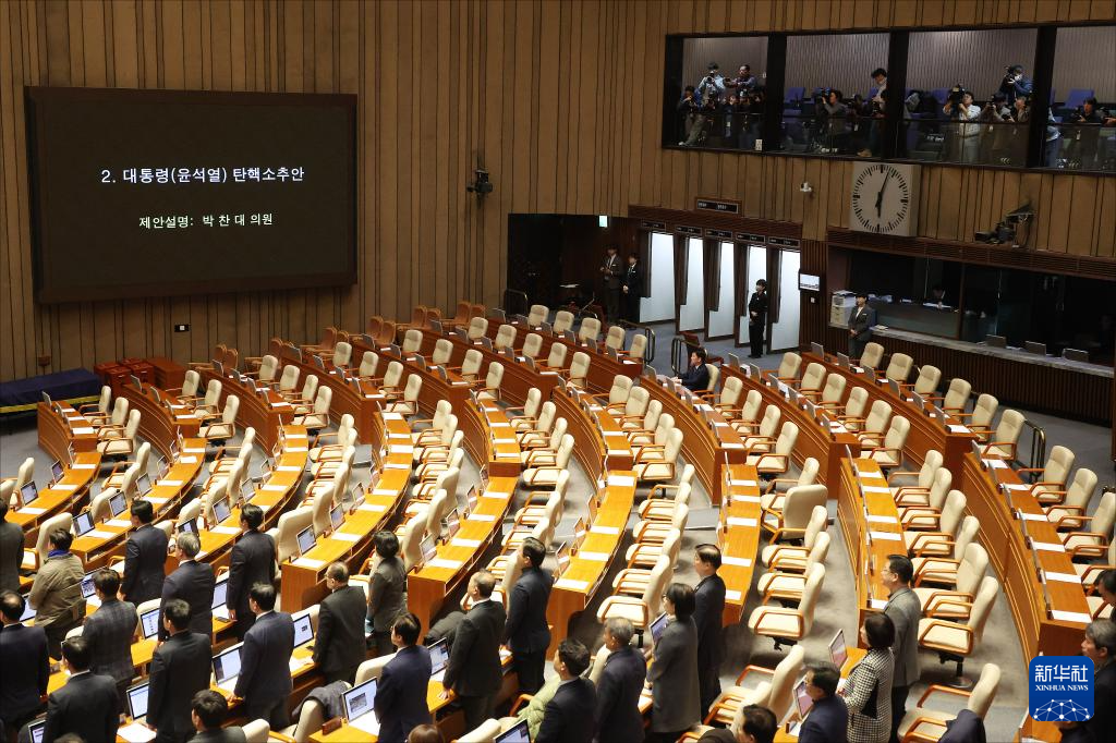 12月7日,在韩国首尔,韩国国会议员听取国会议员朴赞大发表弹劾总统尹锡悦动议案说明。新华社发