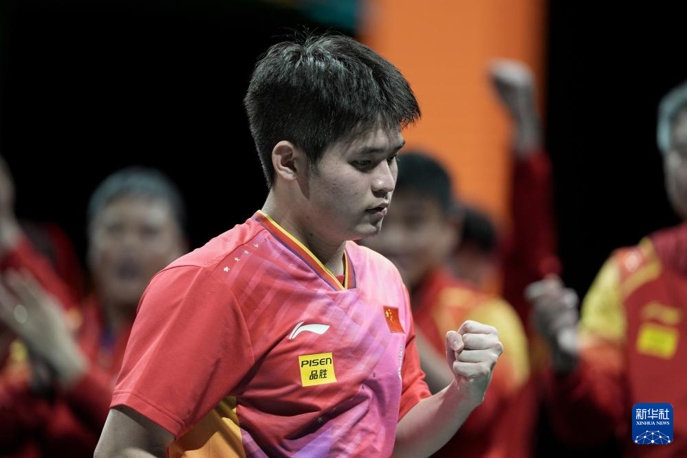 12月8日,中国队选手林诗栋在男单比赛中得分后庆祝。最终,他3比0战胜韩国队选手吴晙诚。新华社记者 胥冰洁 摄