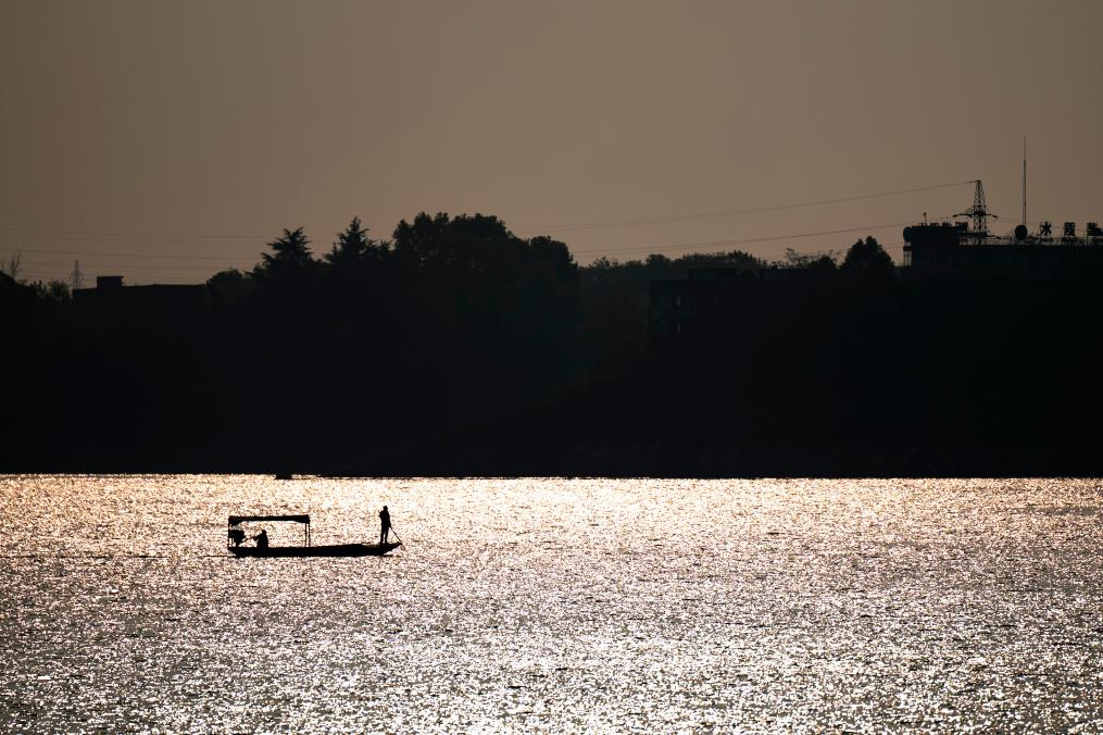 深秋的清晨,朝阳初升,库区水面上波光粼粼。远远望去,小船仿佛在一大片金箔上滑行,船身两侧劈开的浪花如同一颗颗珍珠,旋即又落入水中。老杨手持网兜,立于船头,构成一幅绝妙的剪影。