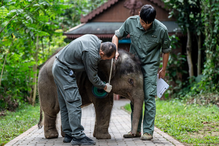 在西双版纳亚洲象救护与繁育中心,“象爸爸”陈继铭(左)、莫诗宇给小象体检(12月8日摄)。
