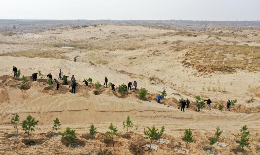 2023年4月15日,在内蒙古通辽市科尔沁左翼后旗,治沙工人在科尔沁沙地植树造林。近年来,依托“三北”防护林等重点生态工程,科尔沁沙地生态环境得到改善。新华社记者 连振 摄
