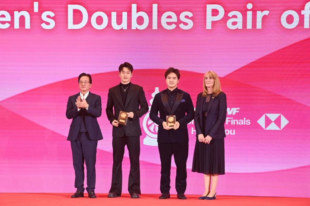 12月9日,获得年度最佳男子双打组合的中国组合梁伟铿(右二)/王昶(左二)在颁奖典礼上。新华社记者 黄宗治 摄