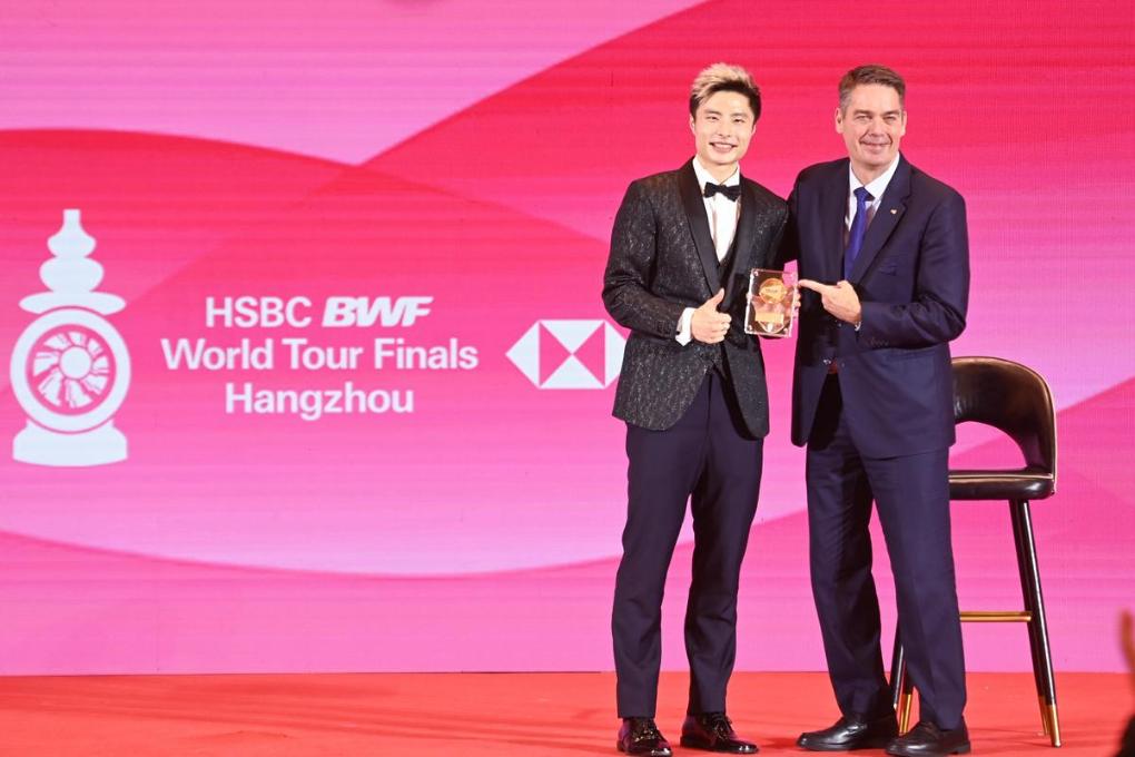 12月9日,世界羽联主席拉尔森为获得年度最佳男子单打运动员的中国选手石宇奇(左)颁奖。新华社记者 黄宗治 摄