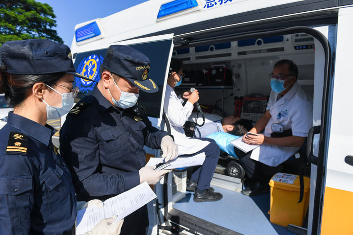 在深圳湾口岸深圳一侧,海关工作人员对参加第二次粤港跨境直通救护车演练的救护车进行出境前的查验(2024年10月31日摄)。新华社记者 毛思倩 摄