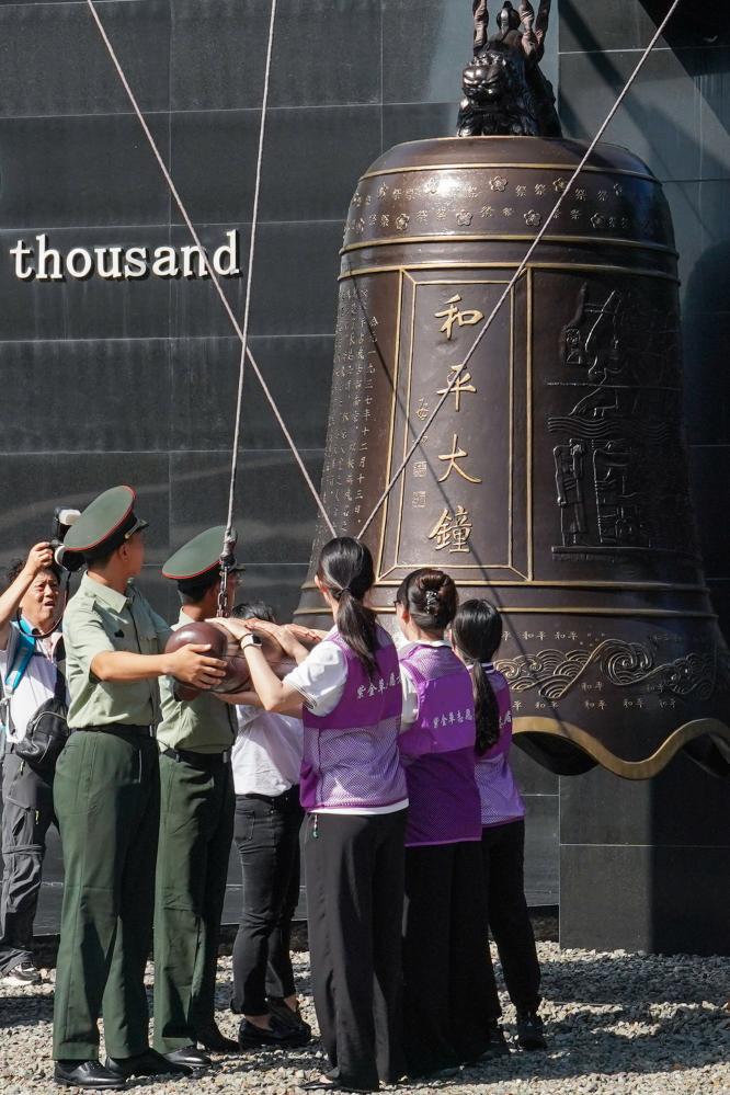 2024年9月18日,社会各界代表在侵华日军南京大屠杀遇难同胞纪念馆撞响和平大钟。 新华社记者 李博 摄