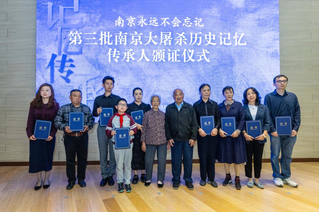 2024年10月11日,第三批南京大屠杀历史记忆传承人与南京大屠杀幸存者艾义英(左六)、刘民生(左七)合影。 新华社发
