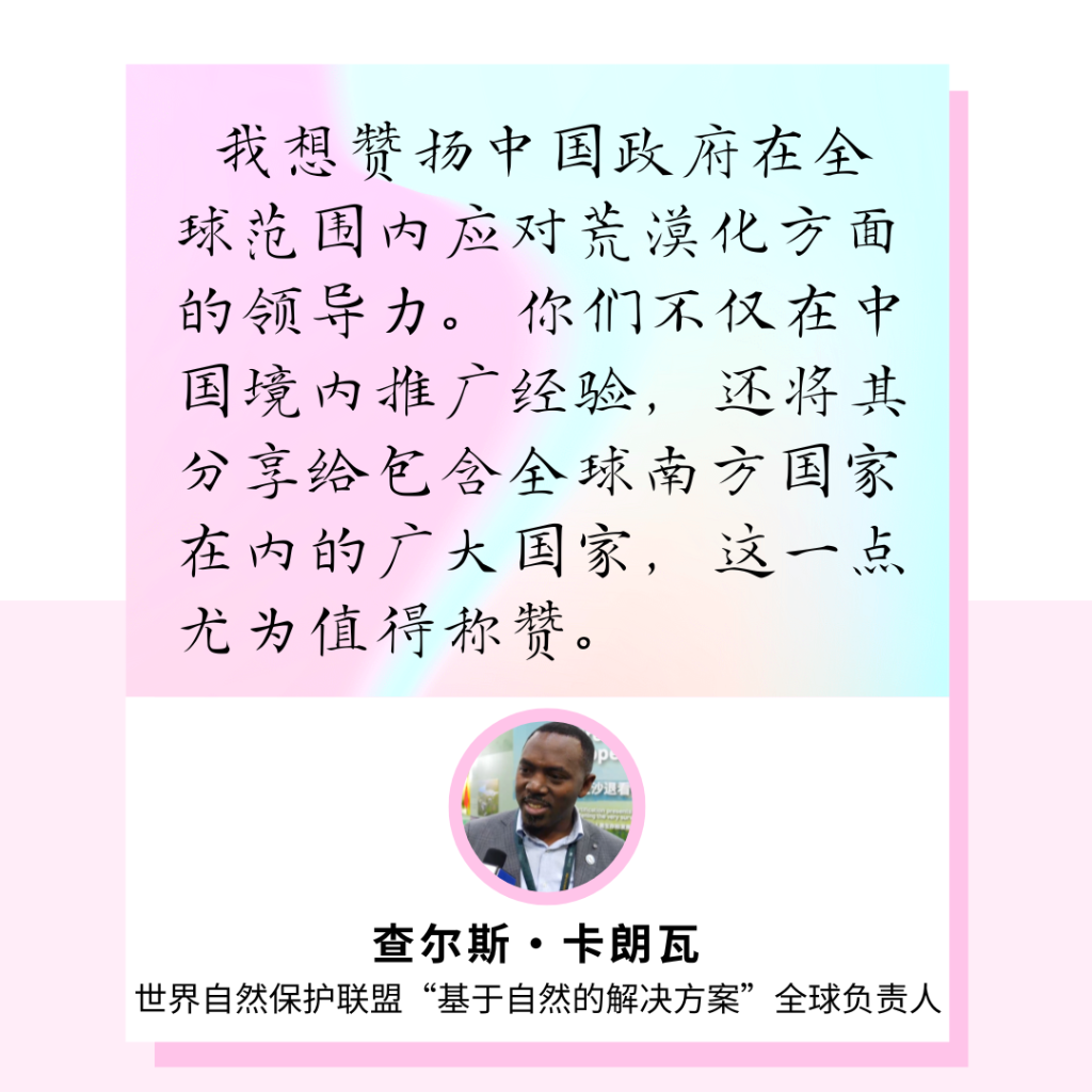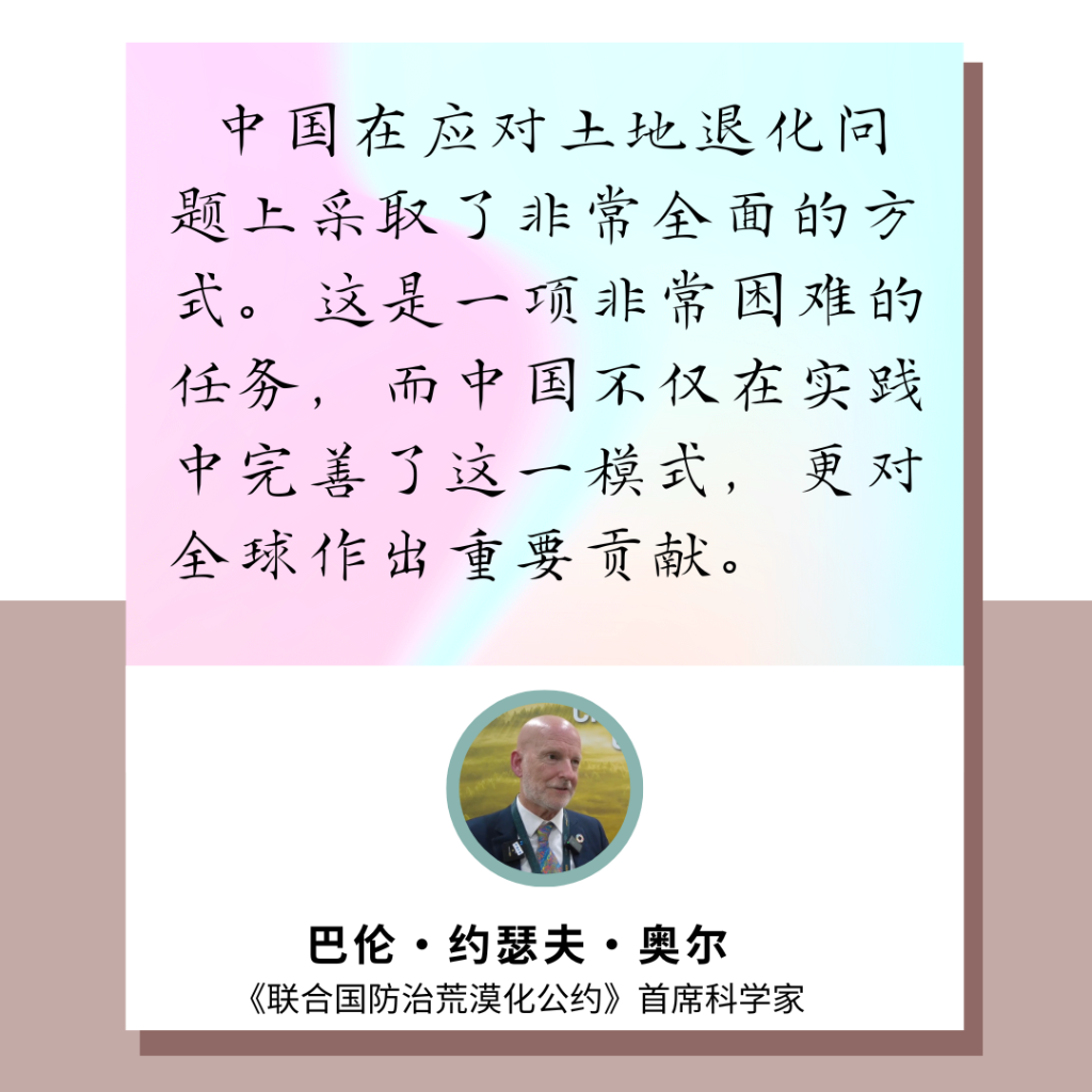 “我想赞扬中国政府在全球范围内应对荒漠化方面的领导力”