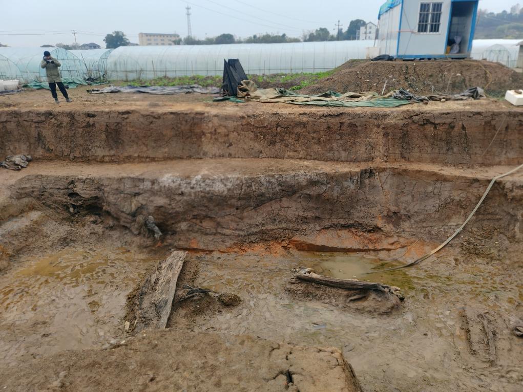 图为古河道遗迹中残留的木构件。新华社记者冯源 摄